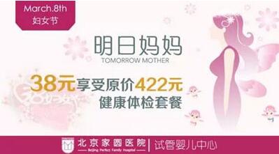 值此三八妇女节到来之际,特推出优生优育体检优惠活动,3月4日-3月12日期间,在家圆不孕症科和计划生育科,您只需38元,便可享受原价422元女性健康体检套餐,无需另缴挂号费。