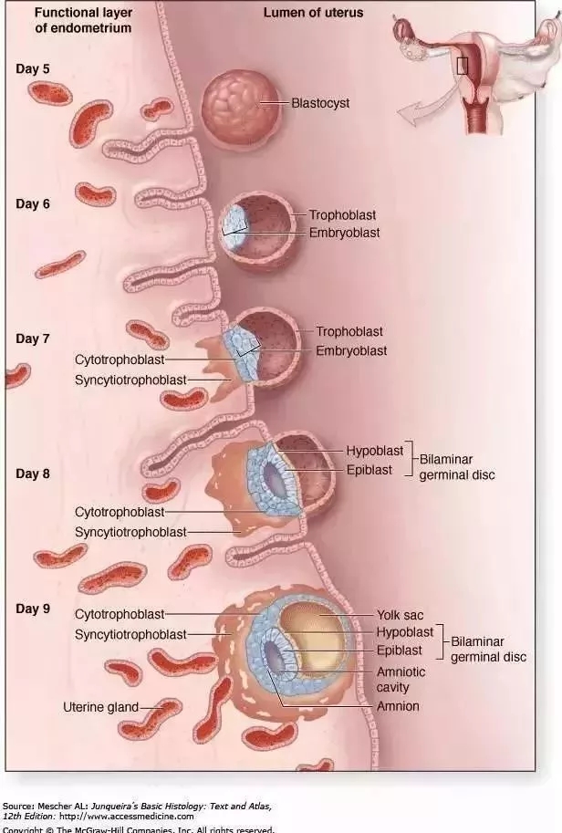 受精卵埋入子宫内膜,被覆盖,植入过程完成。受精卵生长迅速,合体滋养细胞发育,伸出许多呈均匀绒毛状的细胞突起,侵入子宫内膜的肌层和血管中。而滋养细胞分泌的HCG会随着受精卵的发育而越来越多。